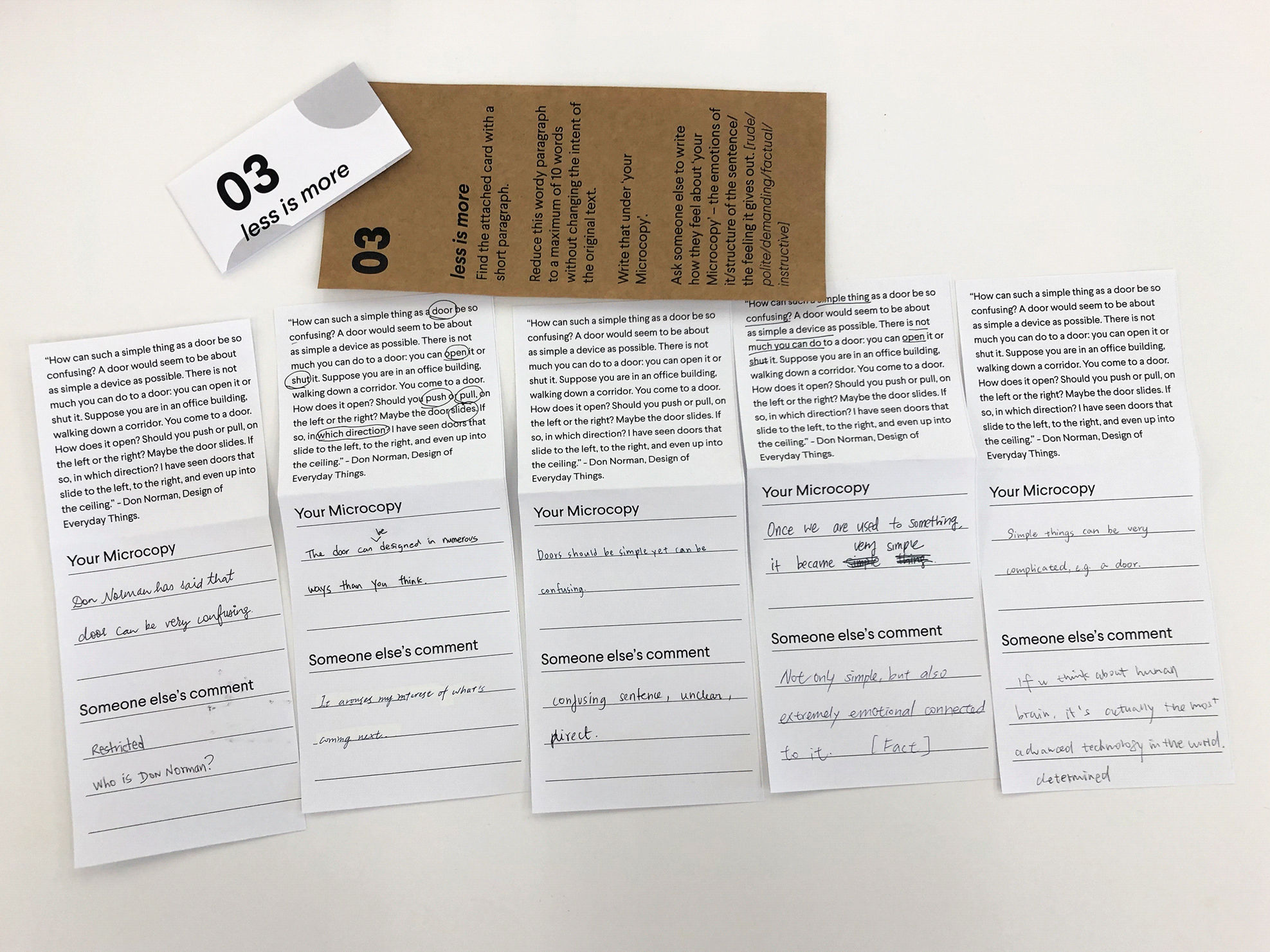The participants wrote down literal meanings/actions/feelings of the word/Microcopy. A few pointed out unnecessary steps to an action or words that did not make sense in that particular interaction. They associated brand names with a few words. Some results showed that the words did not provoke any feeling or seemed invisible because they were used to the interface (muscle memory).