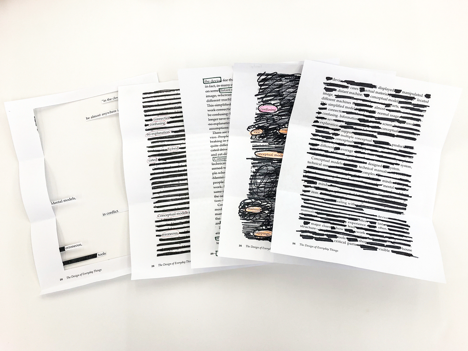 Each participant found a way to represent their chosen words– erasing the other words/sentences, tearing, or scribbling over the words. All of the participants had picked mostly the same words that resonated with them while reading the entire text. They chose a word or group of words based on the clarity it provided to the sentence and the meaning of the passages.